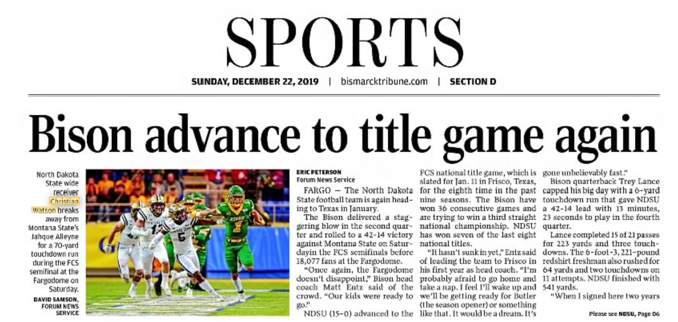 "The Bison erupted for 22 points in the second quarter with sophomore receiver Christian Watson leading the charge," wrote Forum News Service's Eric Peterson. "Watson started the barrage with a 75-yard touchdown catch from (Trey) Lance that gave NDSU a 14-7 lead with 12:34 to play in the quarter. On NDSU's next play from scrimmage, Watson took a handoff on a sweep play and raced 70 yards for a touchdown that gave the Bison a 22-7 lead with 10:51 to play in the first half."