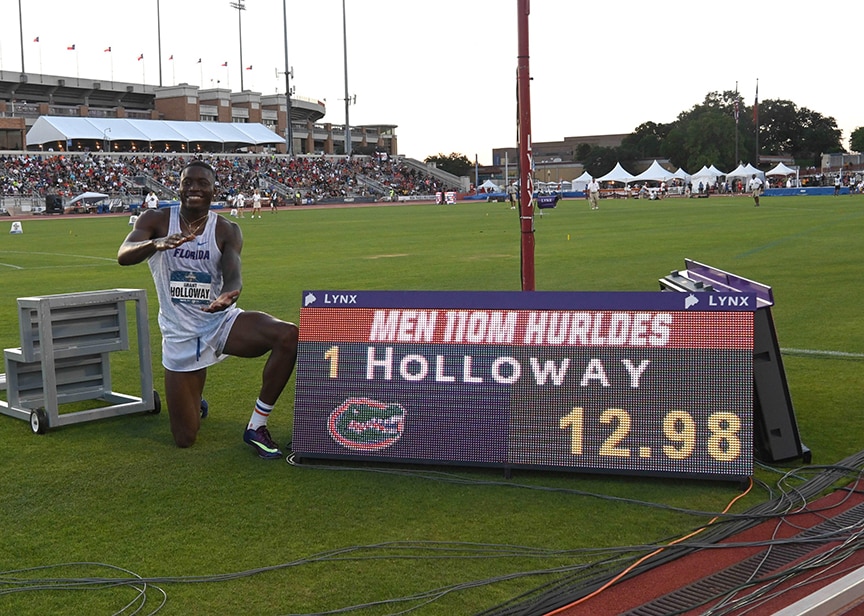 Holloway won the 110-meter hurdles title in 12.98 seconds. He set an NCAA record, breaking Maryland's Renaldo Nehemiah's previous mark of 13.00 seconds.