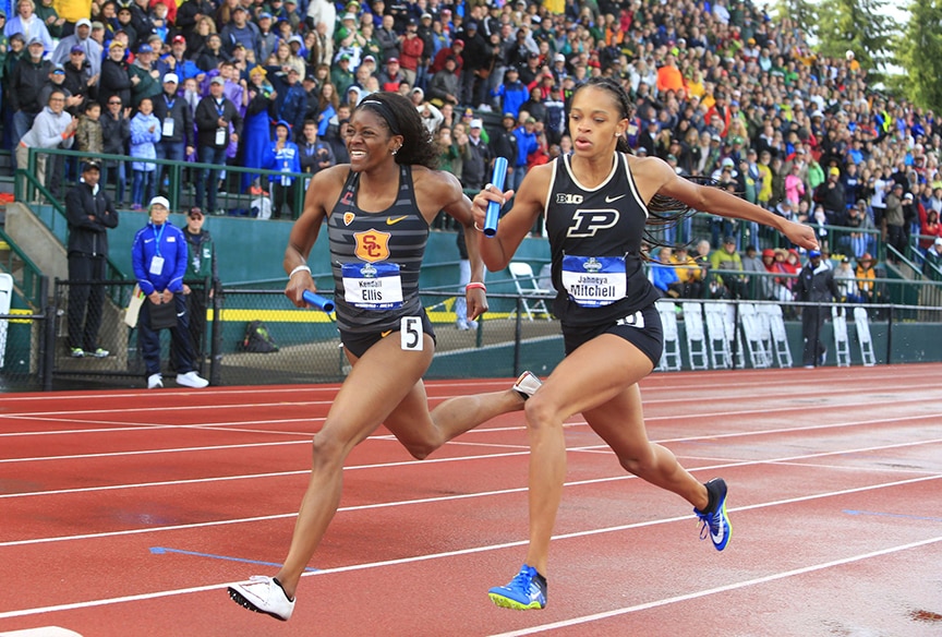 After all of that, there still was one more leg to run. A stumble and a close pass had USC in third, but entering the backstretch, the Trojans trailed Purdue by 30 meters and Oregon by 15 meters.