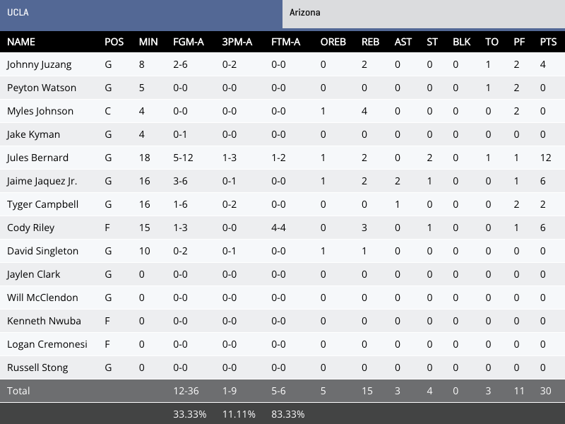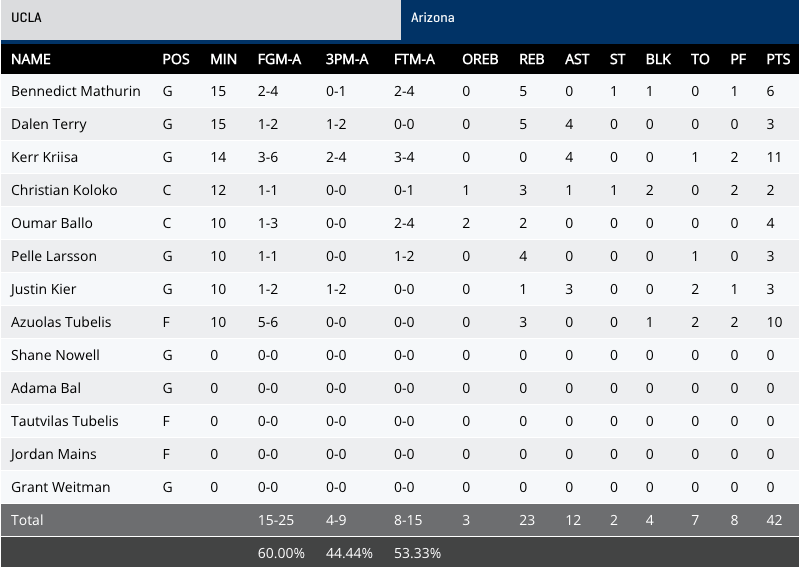 Another factor in this game has been bench points, as both teams had a few players get into some foul trouble they've had to go the bench. UCLA came up ended handed in that department with zero first half bench points and Arizona was able to get 10.