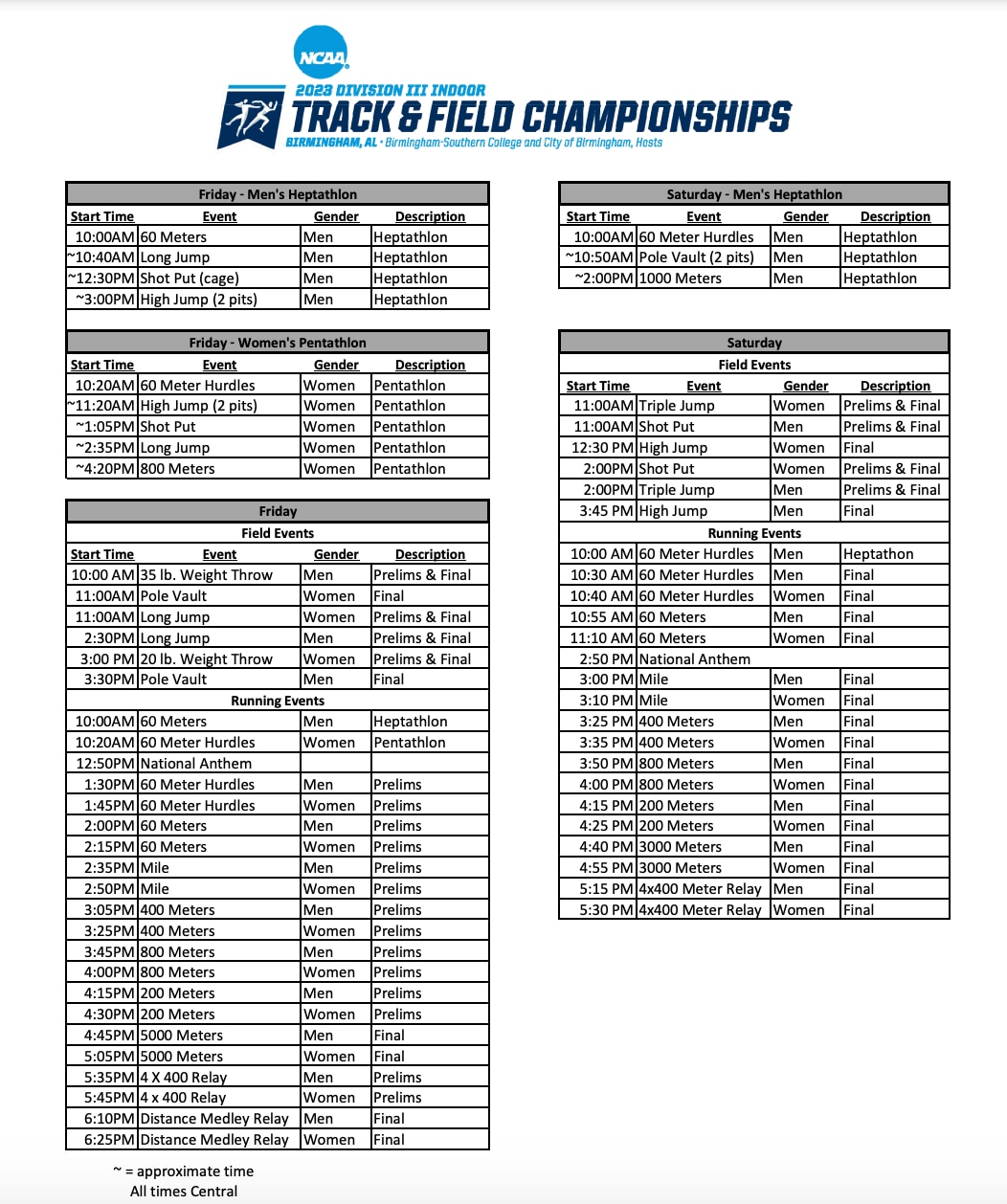 INDIANAPOLIS — The NCAA Division III Men’s and Women’s Track and Field and Cross Country Committee announced today the participants in the 2023 NCAA Division III Men’s and Women’s Indoor Track and Field Championships.