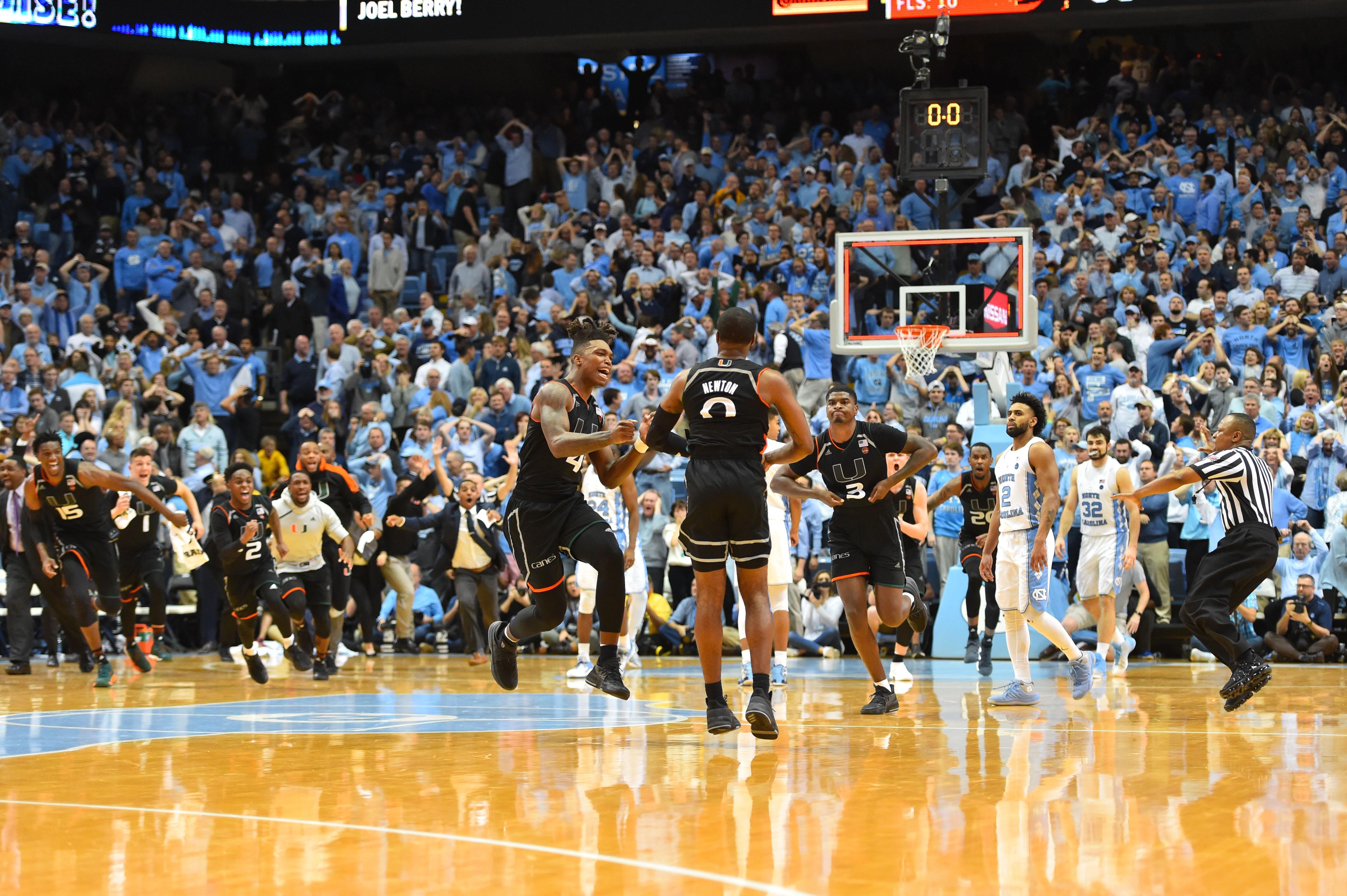 North Carolina's Joel Berry II tied the game on a 3-pointer with 4.1 seconds left in the game but that was enough time for Newton to receive the inbounds pass, and nail a running 40-footer as the final buzzer sounded, giving Miami a 91-88 win.