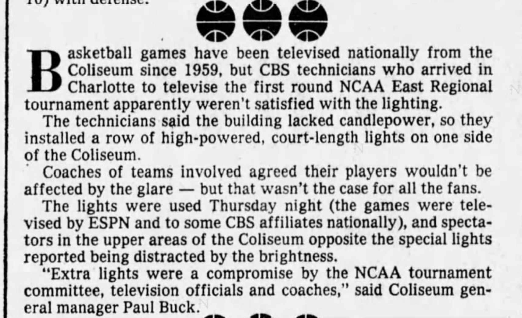 "The technicians said the building lacked candlepower, so they installed a row of high-powered, court-length lights on one side of the Coliseum," The Charlotte Observer reported in a notebook from the NCAA tournament. "Coaches of teams involved agreed their players wouldn't be affected by the glare — but that wasn't the case for all the fans.