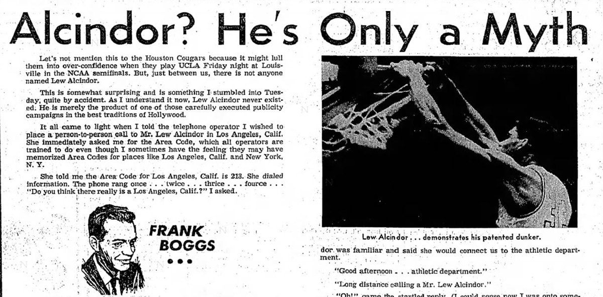 Chicago Tribune: "Did you hear about Lew Alcindor chopping down the cherry tree and then confessing to the Establishment, 'Father, I cannot tell a lie!'? Did you hear about Lew Alcindor driving the snakes from Ireland? Have you heard about Lew Alcindor, the boy, splitting rails in downstate Illinois? You probably have listened to all these tales, and more, too, because Lew Alcindor — star sophomore on the University of California at Los Angeles basketball team — is the most publicized athlete of our time."
