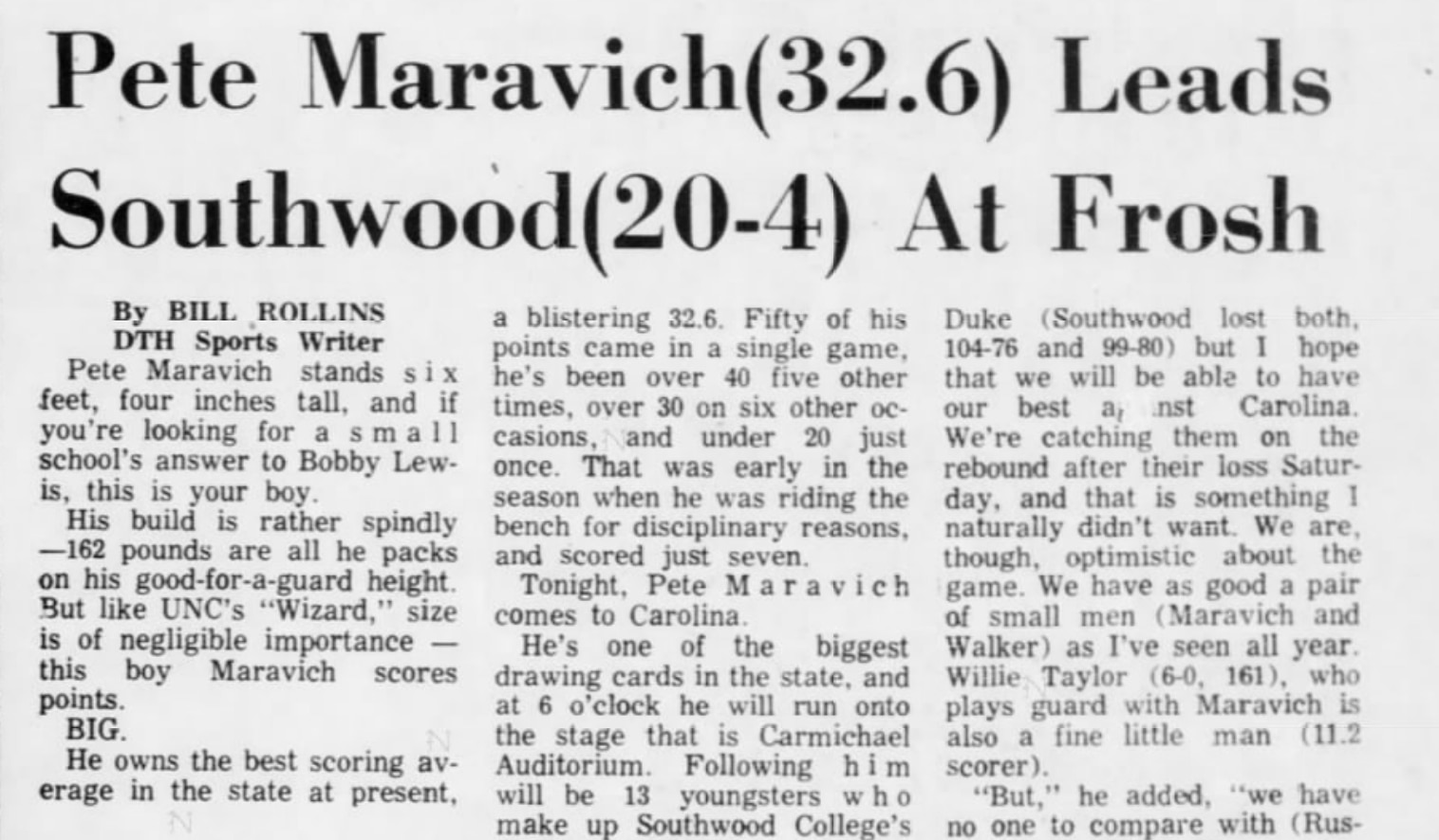 "Pete Maravich stands six feet, four inches tall and if you're looking for a small school's answer to Bobby Lewis, this is your boy," wrote Bill Rollins of The Daily Tar Heel in February 1966. "His build is rather spindly — 162 pounds are all he packs on his good-for-a-guard height." Maravich led the state in scoring at more than 32 points per game and his Southwood College (actually a prep school, not a college) team averaged roughly 101 points per game.