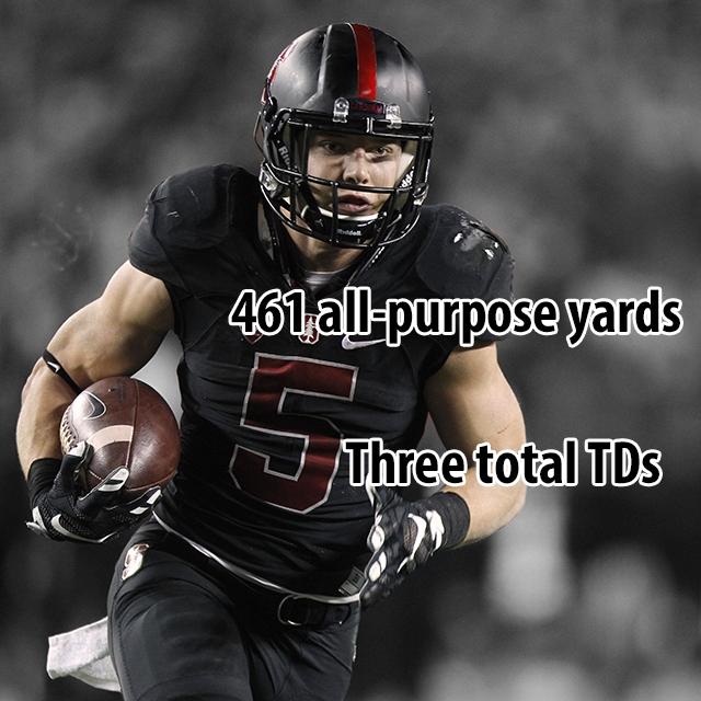 The versatile McCaffrey once again proved why he should be a Heisman Trophy finalist after a record-setting game against USC in the Pac-12 Championship. Between rushing, receiving, returning and even passing, McCaffrey finished with 461 all-purpose yards, bringing his season total to an astonishing 3,496 yards. Not only did McCaffrey break Barry Sander’s previous mark of 3,250 yards, the sophomore running back also scored three touchdowns: one rushing, one receiving and one passing. McCaffrey opened the day with an 11-yard pass to Cardinal quarterback Kevin Hogan on a well-designed trick play in the second quarter, and then score twice in the fourth on a 28-yard touchdown catch and a 10-yard rushing score. The Cardinal went on to win the Pac-12 title in convincing fashion, 41-22.