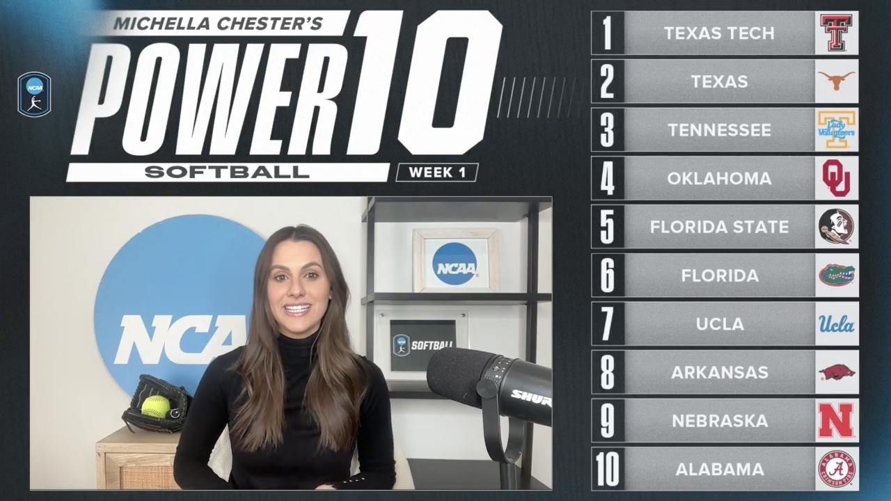 Tennessee takes over as the new No. 1 in the Week 2 College Softball Power 10 after a dominant, undefeated start, while Texas Tech, Texas and Oklahoma round out the top four. Several SEC teams rise in the rankings, with Georgia entering the top 10 following a strong offensive performance in Clearwater.