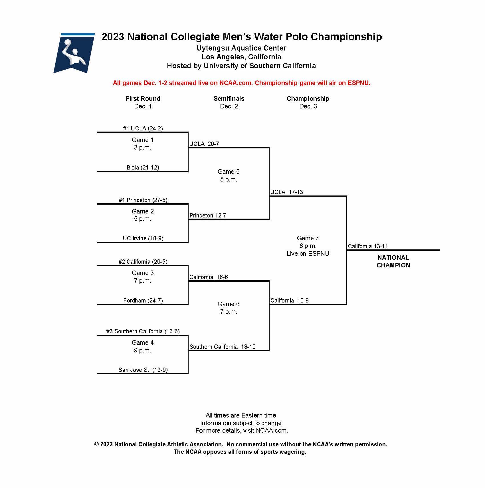 The 2023 NC men's water polo championship began with games on Dec. 1 and continued through the national finals Dec. 3 at Uytengsu Aquatics Center in Los Angeles, CA. Below you can find the scores of each game of the 2023 championship